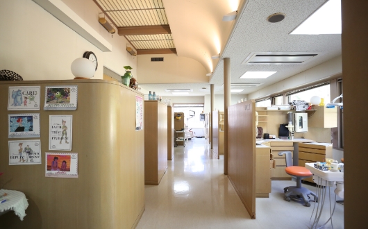 待合室には広いキッズスペースを完備しています。お子さまには「歯科医院は怖くないところ」と思ってもらえるように、院内は明るい雰囲気をつくり、診療中は不安を軽減できるよう配慮した診療に取り組んでいます。